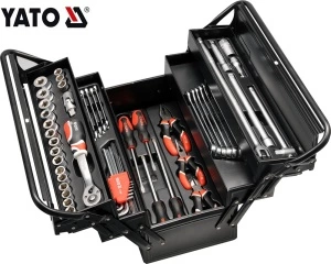 126PCS, 1/2" <(>&<)> 3/8" <(>&<)> 1/4"DR., ALL SOCKETS: 6PT, 2 TONE WITH LATHE KNURLING; 1/2’’DR. REGULAR, 6PT, CRV 50BV30, DIN 3121, AS-DRIVE, LENGTH: 38/42MM, 7PCS (YT-1213 – 20MM/ YT-1214 – 21MM/ YT-1215 – 22MM/ YT-1217 – 24MM/ YT-1218 – 27MM/ YT-1219 – 30MM/ YT-1220 – 32MM), 3/8’’DR. REGULAR, 6PT, CRV 50BV30, DIN 3121, AS-DRIVE, LENGTH: 28/30MM, 11PCS (YT-3804 – 9MM/ YT-3805 – 10MM/ YT-3806 – 11MM/ YT-3807 – 12MM/ YT-3808 – 13MM/ YT- 3809 – 14MM/ YT-3810 – 15MM/ YT-3811 – 16MM/ YT-3812 – 17MM/ YT-3813 – 18MM/ YT-3814 – 19MM), 1/4’’DR. REGULAR, 6PT, CRV 50BV30, DIN 3121, AS- DRIVE, LENGTH: 25MM, 12PCS (YT-1401 – 4MM/ YT-1402 – 4.5MM/YT-1403 – 5MM/ YT-1404 – 5.5MM/ YT-1405 – 6MM/ YT-1406 – 7MM/ YT-1407 – 8MM/ YT- 1408 – 9MM/ YT-1409 – 10MM/ YT-1410 – 11MM/ YT-1411 – 12MM/ YT-1412 – 13MM); 3/8"DR. DEEP, CRV 50BV30, DIN 3121, AS-DRIVE, LENGTH: 63MM, 4PCS (YT-3827 – 13MM/ YT-3828 – 14MM/ YT-3829 – 15MM/ YT-3831 – 17MM), 1/4"DR. DEEP, CRV 50BV30, DIN 3121, AS-DRIVE, LENGTH: 50MM, 4PCS (YT- 1419 – 8MM/ YT-1420 – 9MM/ YT-1421 – 10MM/ YT-1423 – 12MM); STAR SOCKET 3/8’’DR., 6PT, CRV 6150, 8PCS (E8, E10, E11, E12, E14, E16, E18, E20); EXTENSION BAR 1/2"DR., CRV 50BV30, LENGTH: 127MM (YT-1247), 1/2"DR., CRV 50BV30, LENGTH: 254MM (YT-1248), 3/8"DR., CRV 50BV30, LENGTH: 76MM (YT- 3843), 3/8"DR., CRV 50BV30, LENGTH: 152.4MM (YT-3844), 1/4"DR., CRV 50BV30, LENGTH: 50.8MM (YT-1429); THREE WAY JOINT 3/8"(F)x1/2"(M), CRV 50BV30; UNIVERSAL JOINT 1/2"DR., CRV 50BV30 (YT-1252), 3/8"DR., CRV 50BV30 (YT-3850), 1/4"DR., CRV 50BV30 (YT-1437); SPARK PLUG SOCKET 3/8"DR., CRV 50BV30, LENGTH: 64MM, 16MM (YT-3851), 21MM (YT-3852); CURVED RATCHET HANDLE WITH TPR HANDLE 1/2"DR., LENGTH: 255MM, CRV6140 (YT-07293), 3/8"DR., LENGTH: 200MM, CRV6140 (YT-07292), 1/4"DR., LENGTH: 155MM, CRV6140 (YT-07291); SPINNER HANDLE 1/4"DR., LENGTH: 150MM, CRV 50BV30 (YT-1427); ADAPTER 1/2"(F)x3/8"(M), CRV 50BV30, LENGTH: 34MM (YT- 1255), 3/8"(F)x1/2"(M), CRV 50BV30, LENGTH: 35MM (YT-3854), 3/8"(F) x1/4"(M), CRV 50BV30, LENGTH: 27MM (YT-3853); BIT ADAPTER 1/4"x1/4", CRV6140 (YT-1297); SCREWDRIVER BITS 1/4"DR., S2, LENGTH: 25MM, 18PCS (SL: YT-7801 – 4MM/ YT-7802 – 5MM/ YT-7805 – 6.5MM/; PH: YT-7807 – PH1/ YT-7809 – PH3/; PZ: YT-7810 – PZ1/ YT-7811 – PZ2/; TORX TAMPERPROOF: YT- 7822 – T10/ YT-7823 – T15/ YT-7824 – T20/ YT-7825 – T25/ YT-7826 – T27/YT-7827 – T30/ YT-7828 – T40/; HEX: YT-7831 – 3MM/ YT-7832 – 4MM/ YT-7833 – 5MM/ YT-7834 – 6MM); BIT SOCKETS 1/2"DR., AISI S2/ CRV6150, LENGTH: 100MM (SPLINE: YT-0453 – M10), 3/8"DR., AISI S2/ CRV6150, LENGTH: 50MM, 17PCS (SL: YT-7706 - 5.5MM/ YT-7707 - 6.5MM/; PH: YT-7700 - PH1/ 2x YT-7701 - PH2/; TORX: YT-7684 - T20/ YT-7687 - T30/ YT-7688 - T40/; TORX TAMPERPROOF: YT-7709 – T45/ YT-7710 – T50/ YT-7711 – T55/ YT- 7712 – T60/; HEX: YT-7693 - 3MM/ YT-7694 - 4MM/ YT-7695 - 5MM/ YT-7696 - 6MM/ YT-7697 - 7MM); COMBINATION SPANNER DIN 3113, AS-DRIVE, CRV, 9PCS (YT-0337 – 8MM/ YT-0339 – 10MM/ YT-0341 – 12MM/ YT-0342 – 13MM/ YT-0343 – 14MM/ YT-0345 – 16MM/ YT-0346 – 17MM/ YT-0347 – 18MM/ YT-0348 – 19MM); FLARE NUT WRENCH CRV 6140, 2PCS (YT-0135 – 8x10MM/ YT-0136 – 11x12MM); SCREWDRIVER GO-THROUGH CRV 6150, 2PCS (SL: YT-25985 - 6x100MM/; PH: YT- 25993 - PH2x100MM); AUTOMOTIVE CIRCUIT TESTER 6-24V (YT-28522); ADJUSTABLE PLIERS LENGTH: 150MM (YT-1957); OIL FILTER WRENCH CRV, 63- 120MM (YT-0826); HEX KEY LONG SET S2, 9PCS (YT-5877 – 1.5, 2, 2.5, 3, 4, 5, 6, 8, 10MM)