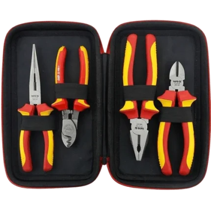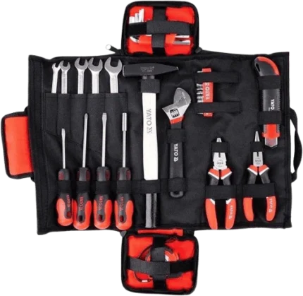 HEX KEY WITH BALL 9PCS 1.5- 10MM CrV (YT-0505); SOCKET 1/4" 6PT CV REGULAR (4MM- YT-1401, 4,5MM- YT-1402, 5MM- YT-1403, 5.5MM- YT-1404, 6MM- YT-1405, 7MM- YT-1406, 8MM- YT-1407, 9MM- YT-1408, 10MM- YT-1409, 11MM- YT-1410, 12MM- YT-1411, 13MM- YT-1412, TWEEZER 140MM (YT-6903); ELECTRICIAN'S KNIFE (YT-7601); ADJUSTABLE WRENCH 6" 150 MM (YT-2071); LONG NOSE PLIERS 160MM INSULATED 1000V (YT-21154); SIDE CUTTING PLIERS 160MM INSULATED 1000V (YT-21158); MEASURING TAPE 3Mx16MM NYLON (YT-7150); AUTOMATIC WIRE STRIPPER 175MM (YT-2268); VOLTAGE TESTER (YT-2861); ALUMINIUM LED TORCH, 9LED, MATERIAL LOOP, RUBBER BUTTON, COLOUR: BLACK (YT-08570); UTILITY KNIFE 9MM SK2 (YT-7502); ELECTRICAL INSULATION TAPE PVC 0.13MM 19MMx20M BLACK (YT-8165); SPINNER HANDLE 1/4'' DR. (YT-1427); DIGITAL MULTIMETER (YT-73080); DESOLDERING PUMP 19.5x190MM (YT-82742); BIT ADAPTER 1/4''x1/4" (YT-1297); INSULATED SCREWDRIVER 1000V 4x75MM (YT-2816); INSULATED SCREWDRIVER 1000V 5.5x125MM (YT-2818); INSULATED SCREWDRIVER PH1x80MM (YT-2822); INSULATED SCREWDRIVER PH2x100MM (YT-2823); PRECISION SCREWDRIVER SET 6PCS S2 (YT-25861); SOLDERING IRON 30W (YT-8271); SOLDERING WIRE; SCREWDRIVER BITS 20PCS; ALUMINIUM LED TORCH (9 LED, MATERIAL LOOP, RUBBER BUTTON, COLOUR: BLACK)