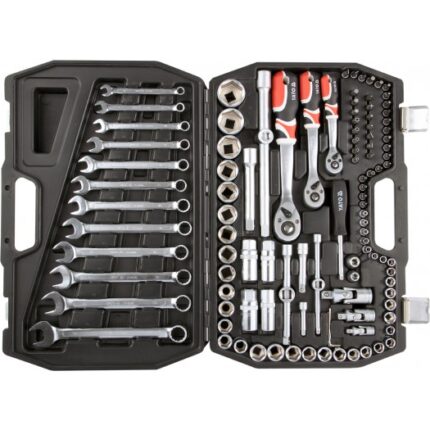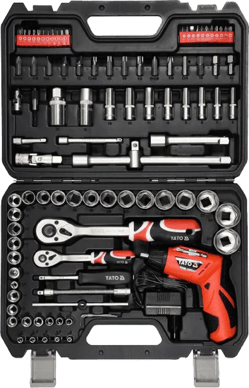 | 111PCS; 1/2" & 3/8" & 1/4"; ALL SOCKETS: 6PT, MATERIAL: CRV 50BV30, 2 TONE WITH LATHE KNURLING, 1/2''DR. REGULAR, DIN 31 21, AS-DRIVE, LENGTH: 38/42MM, 14PCS (YT-1207 - 14MM/ YT-1208 - 15MM/ YT-1209 - 16MM/ YT-1210 - 17MM/ YT-1211 - 18MM/ YT -1212 - 19MM/ YT-1213 - 20MM/ YT-1214 - 21MM/ YT-1215 - 22MM/ YT-1216 - 23MM/ YT-1217 - 24MM/ YT-1218 - 27MM/ YT-1219 - 30MM/ YT-1220 - 32MM), 3/8''DR. REGULAR, DIN 3121, AS-DRIVE, LENGTH: 28/30MM, 11PCS (YT-3804 - 9MM/ YT-3805 - 10MM/ YT-3 806 - 11MM/ YT-3807 - 12MM/ YT-3808 - 13MM/ YT-3809 - 14MM/ YT-3810 - 15MM/ YT-3811 - 16MM/ YT-3812 - 17MM/ YT-3813 - 18 MM/ YT-3814 - 19MM), 1/4''DR. REGULAR, DIN 3121, AS-DRIVE, LENGTH: 25MM, 13PCS (3.5MM/ YT-1401 - 4MM/ YT-1402 - 4.5MM/ Y T-1403 - 5MM/ YT-1404 - 5.5MM/ YT-1405 - 6MM/ YT-1406 - 7MM/ YT-1407 - 8MM/ YT-1408 - 9MM/ YT-1409 - 10MM/ YT-1410 - 11M M/ YT-1411 - 12MM/ YT-1412 - 13MM); EXTENSION BAR 1/2"DR., CRV 50BV30, LENGTH: 127MM (YT-1247), 1/2"DR., CRV 50BV30, LEN GTH: 254MM (YT-1248), 3/8"DR., CRV 50BV30, LENGTH: 76MM (YT-3843), 3/8"DR., CRV 50BV30, LENGTH: 152.4MM (YT-3844), 1/4"D R., CRV 50BV30, LENGTH: 50.8MM (YT-1429), 1/4''DR., CRV 50BV30, LENGTH: 152.4MM (YT-1432); THREE WAY JOINT 3/8"(F)X1/2"( M), CRV 50BV30, 1/2"(F)X3/8”(M), CRV 50BV30, 3/8"(F)X1/4"(M), CRV 50BV30; UNIVERSAL JOINT 1/2"DR., CRV 50BV30 (YT-1252), 3/8"DR., CRV 50BV30 (YT-3850), 1/4"DR., CRV 50BV30 (YT-1437); SPARK PLUG SOCKET 1/2"DR., CRV 50BV30, LENGTH: 64MM, 16M M (YT-1253), 21MM (YT-1254), 3/8"DR., CRV 50BV30, LENGTH: 64MM, 16MM (YT-3851), 21MM (YT-3852); CURVED RATCHET HANDLE WI TH TPR HANDLE 1/2"DR., LENGTH: 255MM, CRV6140 (YT-0732), 3/8"DR., LENGTH: 200MM, CRV6140 (YT-0731), 1/4"DR., LENGTH: 155 MM, CRV6140 (YT-0730); SPINNER HANDLE 1/4"DR., LENGTH: 150MM, CRV 50BV30 (YT-1427); BIT ADAPTER 1/2"X5/16”, CRV6140 (YT- 1295), BIT ADAPTER 3/8"X5/16”, CRV6140 (YT-1296); SCREWDRIVER BITS 5/16", S2, LENGTH: 30MM, 15PCS (SL: 6MM/ YT-7892 - 6. 5MM/ YT-7893 - 8MM/; PH: YT-7895 - PH2/ YT-7896 - PH3/; PZ: PZ2/ PZ3/; TORX TAMPERPROOF: YT-7912 - T27/ YT-7913 - T30/ T 35/ YT-7914 - T40/ YT-7915 - T45/; HEX: 5.5MM/ YT-7921 - 6MM/ 6.5MM); BIT SOCKETS 1/4"DR., AISI S2/ CRV6150, LENGTH: 37M M, 21PCS (SL: YT-7679 - 4MM/ YT-7680 - 5.5MM/ YT-7681 - 6.5MM/; PH: YT-7673 - PH1/ YT-7674 - PH2/; PZ: YT-7676 - PZ1/ YT -7677 - PZ2/; TORX: YT-7660 - T8/ YT-7661 - T10/ YT-7662 - T15/ YT-7663 - T20/ YT-7664 - T25/; TORX TAMPERPROOF: T10/ T1 5/ T20/ T25/ T40/; HEX: YT-7667 - 3MM/ YT-7668 - 4MM/ YT-7669 - 5MM/ YT-7670 - 6MM); COMBINATION SPANNER DIN 3113, AS-DR IVE, CRV, 12PCS (YT-0337 - 8MM/ YT-0338 - 9MM/ YT-0339 - 10MM/ YT-0340 - 11MM/ YT-0341 - 12MM/ YT-0342 - 13MM/ YT-0343 - 14MM/ YT-0344 - 15MM/ YT-0345 - 16MM/ YT-0346 - 17MM/ YT-0347 - 18MM/ YT-0348 - 19MM); HEX KEY CRV 6150, 3PCS (1.5, 2, 2.5MM) |