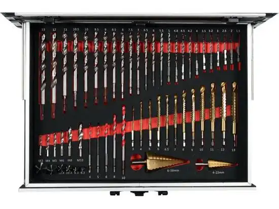 189 PCS; YOUR ITEM NO.: F5SRP7B; DIMENSIONS 958x766x465MM;7 DRAWERS W/ BALL BEARINGS (5 SMALL, 1 MIDDLE, 1 LARGE); PLASTIC WORKTOP; CENTRALISED LOCK, MAX. CAPACITY: SMALL DRAWER - 25KG, MIDDLE DRAWER - 35KG, LARGE DRAWER - 35KG; DIMENSIONS: SMALL DRAWER - 533x391x58MM, MIDDLE DRAWER - 533x391x128MM, LARGE DRAWER - 533x391x195MM; 4 WHEELS 125MM: 2 FIXED, 2 CASTORS (2 W/ BRAKE), UNIVERSAL PREFORMATION SIDE WALL, WEIGHT: 62KG; TRAY 1: 16PCS YATO COMBINATION SPANNERS, GERMAN TYPE, SATIN FINISH WITH POLISHED HEAD, 15 DEG OFFSET, CR-V; AS DRIVE, YT-0335~YT-0350 (6/ 7/ 8/ 9/ 10/ 11/ 12/ 13/ 14/ 15/ 16/ 17/ 18/ 19/ 20/ 21MM), PVC TRAY FOR 1/3 DRAWER / TRAY 2: 6PCS YATO COMBINATION SPANNERS, GERMAN TYPE, SATIN FINISH WITH POLISHED HEAD, 15 DEG OFFSET; CR-V; AS DRIVE, YT-0351~YT-0360 (22/ 24/ 27/ 28/ 30/ 32MM), PVC TRAY FOR 1/3 DRAWER / TRAY 3: 40 PCS SCREWDRIVER BIT SET, S2 STEEL, ADAPTOR 1/2" <(>&<)> 3/8": 14 PCS HEX BITS, 30MM (H4, 5, 6, 7, 8, 10, 12) <(>&<)> 75MM (H4, 5, 6, 7, 8, 10, 12) / 14PCS TORX BITS, 30MM (T20, T25, T30, T40, T50, T55) <(>&<)> 75MM (T20, T25, T30, T40, T50, T55) / 10PCS SPLINE BITS, 30MM (M5, 6, 8, 10, 12) <(>&<)> 75MM (M5, 6, 8, 10, 12) / PVC TRAY FOR 1/3 DRAWER TRAY 4: 24PCS SOCKET SET, 6PT, 1/2" DRIVE, CRV50BV30, AS-DRIVE, 2 TONE WITH KNURLING, YT-1203~YT-1243 (10/ 11/ 12/ 13/ 14/ 15/ 16/ 17/ 18/ 19/ 20/ 21/ 22/ 23/ 24/ 27/ 30/ 32MM), YT-0732 CURVED RATCHET HANDLE, 1/2", CRV 6140, 72TH, CURVED / YT-1247 EXTENSION BAR 1/2" 127MM / YT-1252 UNIVERSAL JOINT 1/2", YT-1253~YT-1254 SPARK PLUG SOCKET 1/2", 16MM, 21MM, YT-1243 SLIDING T-BAR 1/2" 255MM / PVC TRAY FOR 1/3 DRAWER / TRAY 5: 4PCS YATO PLIERS, YT-1941 COMBINATION PLIERS, CR-V, 180MM / YT- 1943 LONG NOSE PLIERS, CR-V, 160MM, YT-1945 BENT NOSE PLIERS, CRV, 160MM / YT-1947 SIDE CUTTING PLIERS, CRV, 160MM / PVC TRAY FOR 1/3 DRAWER TRAY 6: 5PCS HAMMERS AND PUNCHES: YT-4503 SAFETY MACHINIST HAMMER 300G, YT-4625 DEAD BLOW HAMMER BOOTS 40MM, YT-4711 CHISEL SET, 3 PCS: 10MMx8MMx142MM, 12MMx10MMx152MM, 16MMx13MMx170MM, CRV STEEL / PVC TRAY FOR 1/3 DRAWER; TRAY 7: 13 PCS SCREWDRIVER SET: SLOTTED PRECISION SCREWDRIVER 1.4x50MM S2 (YT-25802), SLOTTED PRECISION SCREWDRIVER 2.0x50MM S2 (YT-25805), SLOTTED PRECISION SCREWDRIVER 2.4x50MM S2 (YT- 25807), PHILLIPS PRECISION SCREWDRIVER PH00x50MM S2 (YT-25833), PHILLIPS PRECISION SCREWDRIVER PH0x50MM S2 (YT-25835), PHILLIPS PRECISION SCREWDRIVER PH1x50MM S2 (YT-25838), SLOTTED SCREWDRIVER 3x75MM S2 (YT- 25901), SLOTTED SCREWDRIVER 4x100MM S2 (YT-25904), SLOTTED SCREWDRIVER 5x75MM S2 (YT-25907), SLOTTED SCREWDRIVER 6x100MM S2 (YT-25911), PHILLIPS SCREWDRIVER PH0x75MM S2 (YT-25920), PHILLIPS SCREWDRIVER PH1x75MM S2 (YT-25923), PHILLIPS SCREWDRIVER PH2x100MM S2 (YT-25929) TRAY 8: 4 PCS GO-THRU SCREWDRIVERS SET: PHILLIPS SCREWDRIVER PH2x150MM GO-THROUGH 6150CRV (YT-25994), PHILLIPS SCREWDRIVER PH3x200MM GO-THROUGH 6150CRV (YT-25996), SLOTTED SCREWDRIVER 6x150MM GO-THROUGH 6150CRV (YT- 25986), SLOTTED SCREWDRIVER 8x200MM GO-THROUGH 6150CRV (YT-25990) TRAY 9: 4 PCS LOCK GRIP PLIERS AND ADJUSTABLE WRENCHES SET: LOCKING PLIERS 10" (250MM) (YT-2451); LOCKING PLIERS 6" (150MM) (YT-2459); ADJUSTABLE WRENCH 8" (200 MM) (YT-2072); ADJUSTABLE WRENCH 10" (250 MM) (YT-2073) TRAY 10: 35 PCS TAP AND DIE SET: HAND TAP M3 / 3PCS HSS M2 (YT-2930); HAND TAP M4 / 3PCS HSS M2 (YT-2931); HAND TAP M5 / 3PCS HSS M2 (YT-2932); HAND TAP M6 / 3PCS HSS M2 (YT-2933); HAND TAP M7 / 3PCS HSS M2 (YT-2934); HAND TAP M8 / 3PCS HSS M2 (YT-2935); HAND TAP M10 / 3PCS HSS M2 (YT-2937); HAND TAP M12 / 3PCS HSS M2 (YT-2939); DIE M3 HSS M2; DIE M4 HSS M2 (YT-2961); DIE M5 HSS M2 (YT-2962); DIE M6 HSS M2 (YT- 2963); DIE M7 HSS M2 (YT-2964); DIE M8 HSS M2 (YT-2965); DIE M10 HSS M2 (YT-2967); DIE M12 HSS M2 (YT-2969); THREAD PATTERN; TAP WRENCH M3-M12 (YT-2992); DIE HANDLE, M7-M9 (YT-2982) TRAY 11: 4 PCS CIRCLIP PLIERS SET: CIRCLIP PLIERS STRAIGHT EXTERNAL 180MM CRV50 (YT-2136); CIRCLIP PLIERS STRAIGHT INTERNAL 180MM CRV50 (YT- 2137); CIRCLIP PLIERS BENT EXTERNAL 180MM CRV50 YT-2138); CIRCLIP PLIERS BENT INTERNAL 180MM CRV50 (YT-2139); TRAY 12: 5 PCS FILES SET: STEEL FILE, SHAPE FLAT, CUT (2), 200MM (YT-6185); STEEL FILE, SHAPE SQUARE, CUT (2), 200MM (YT-6186); STEEL FILE, SHAPE TRIANGLE, CUT (2), 200MM (YT-6187); STEEL FILE, SHAPE HALF-ROUND, CUT (2), 200MM (YT-6188); STEEL FILE, SHAPE ROUND, CUT (2), 200MM (YT-6189) / TRAY 13: 23 PCS TOOLS SET: ELECTRICIAN SCISSORS 140MM (YT-1974), FOLDED KNIFE (YT-7600), INSULATION TAPE 19MMx20M, BLACK COLOUR (YT-8165), VOLTAGE TESTER 250V 4X190MM (YT-2830), TWIST DRILL BIT SET 19 PCS (YT-4462)/TRAY 14: 6 PCS TOOLS SET: SWEDISH TYPE PIPE WRENCH S 1,0" (YT-2216); TIN SNIPS 10' STRAIGHT (YT-1962); HAND RIVETER 2.4-4.8MM (YT-36011); ALUMINIUM BLIND RIVETS 9,6x4,0MM 50 PCS (70410); ALUMINIUM BLIND RIVETS 12,7x4,8MM 50 PCS (70500); ALUMINIUM BLIND RIVETS 9,6x3,2MM 50 PCS (70330); PVC TRAY FOR 2/3 DRAWER; COLOUR OF TRAYS: BLACK