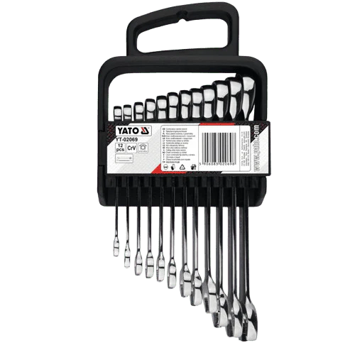 The YATO YT-02069 Combination Ratchet Spanner Set is a high-quality, durable toolset designed for both professional and home use. Made from chrome-vanadium steel (CrV), these spanners offer superior strength and corrosion resistance. With 12 pieces, the set covers a wide range of sizes, providing versatility for various mechanical tasks.